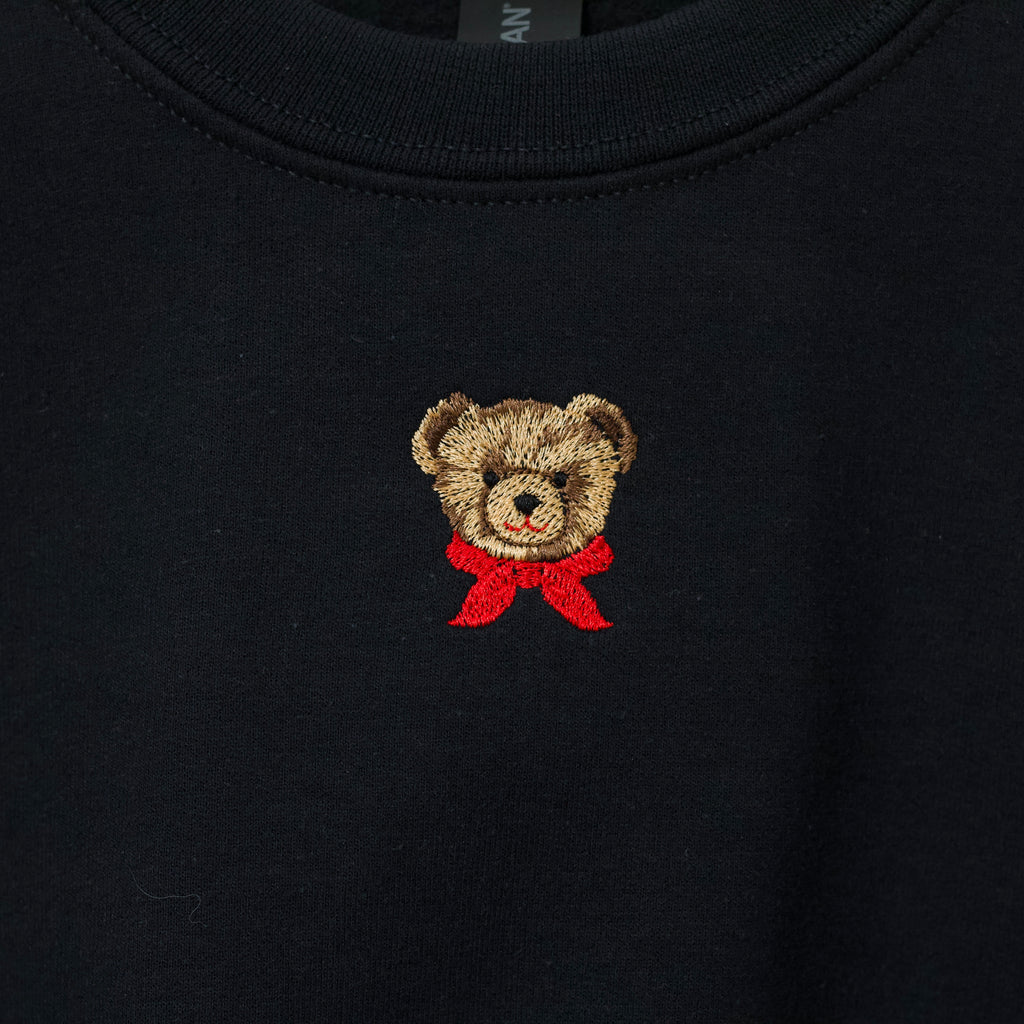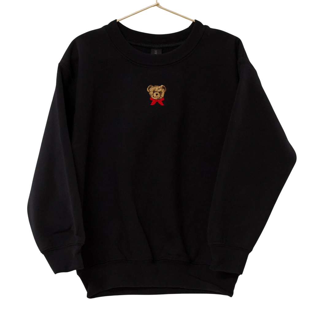 Black crewneck pull over sweatshirt with brown embroidered bear with red neck tie. Sweatshirt is Gildan brand youth heavy blend.
