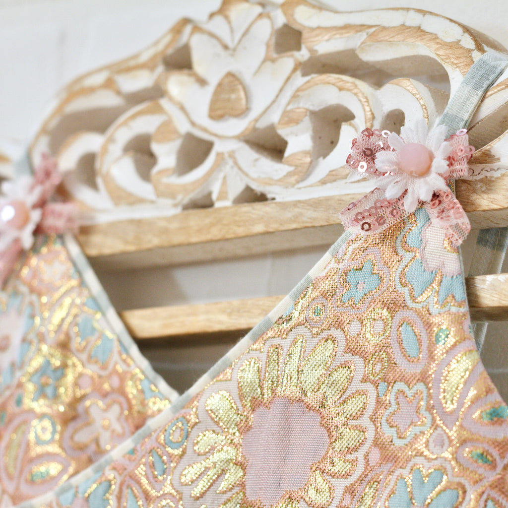 Hand wash, No Bleach, Line Dry, Cool Iron on straps, Reverse iron on Brocade.