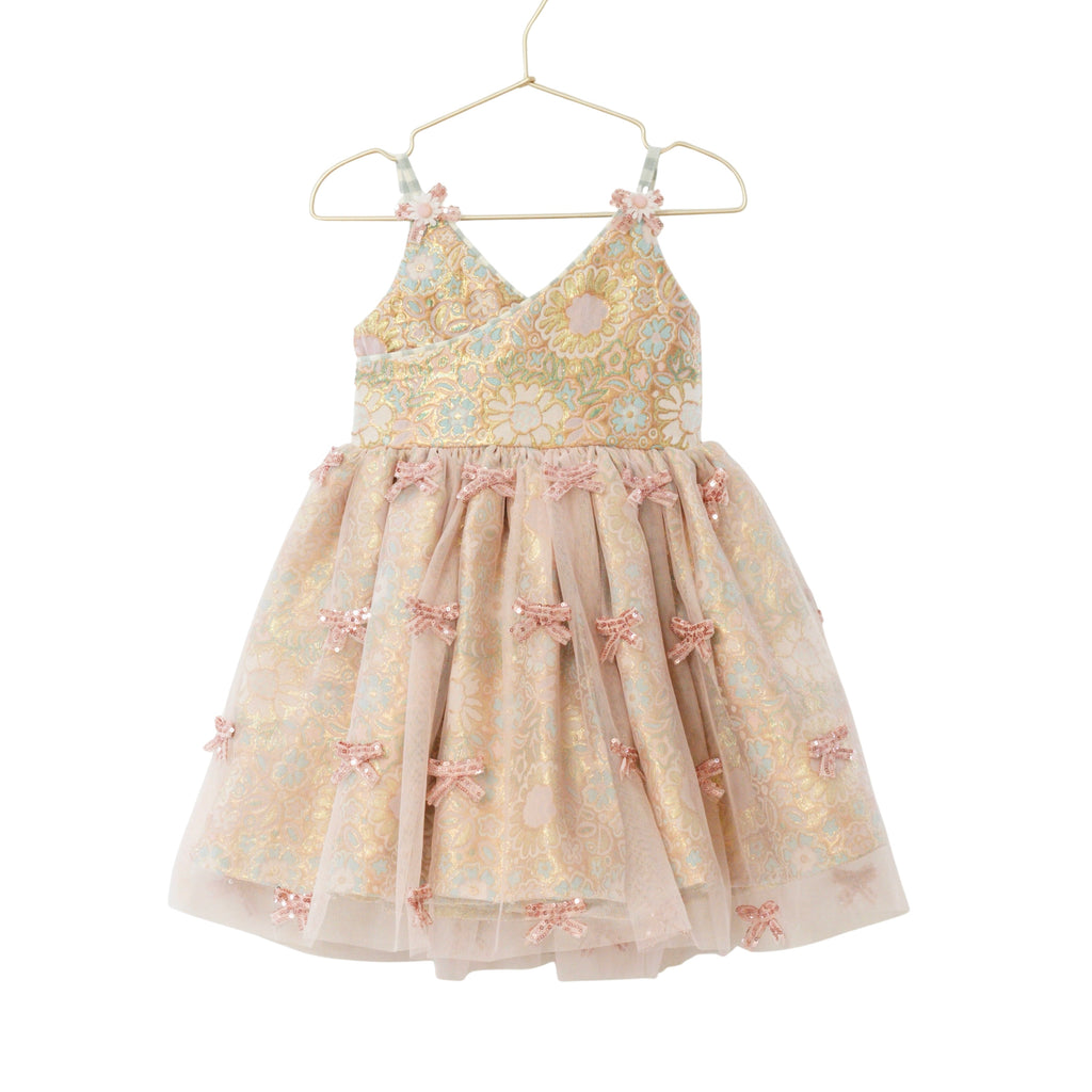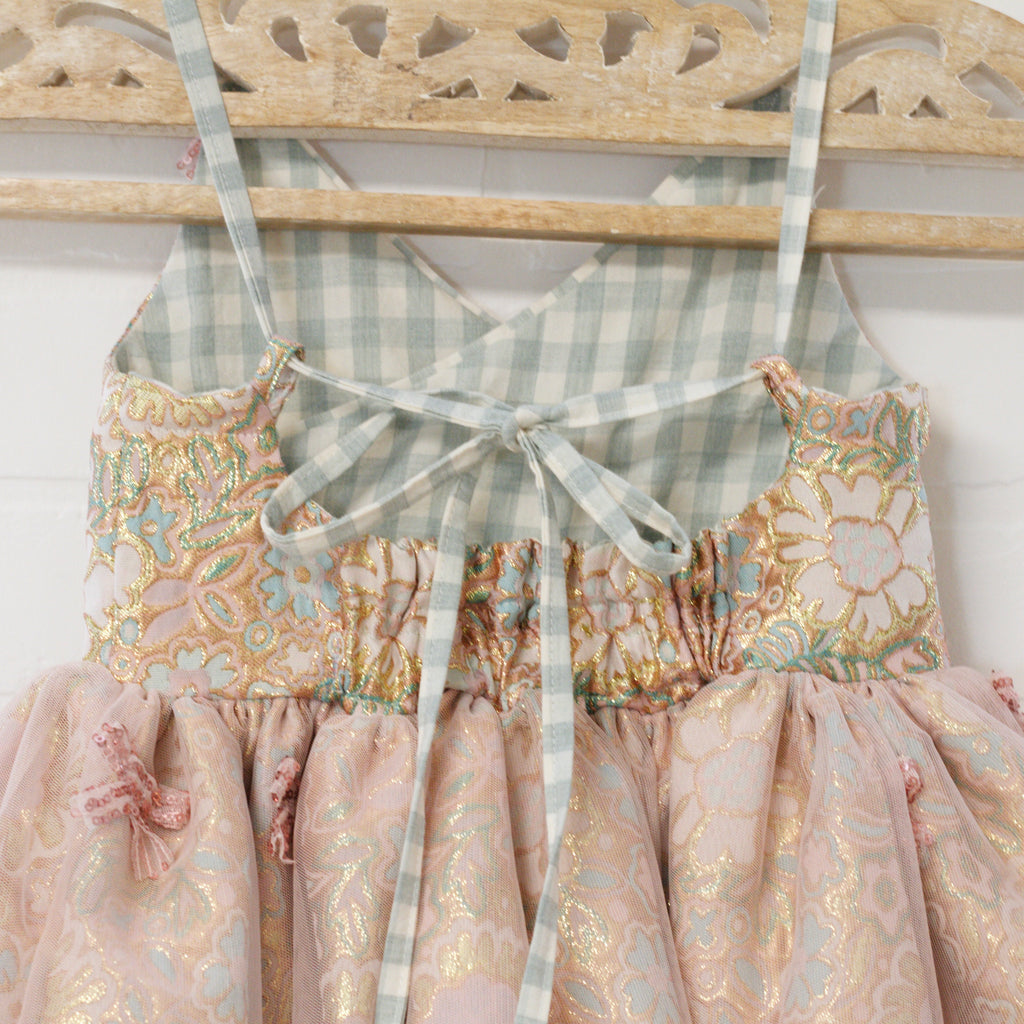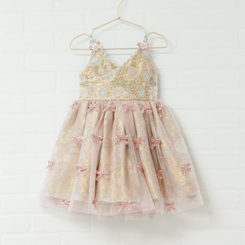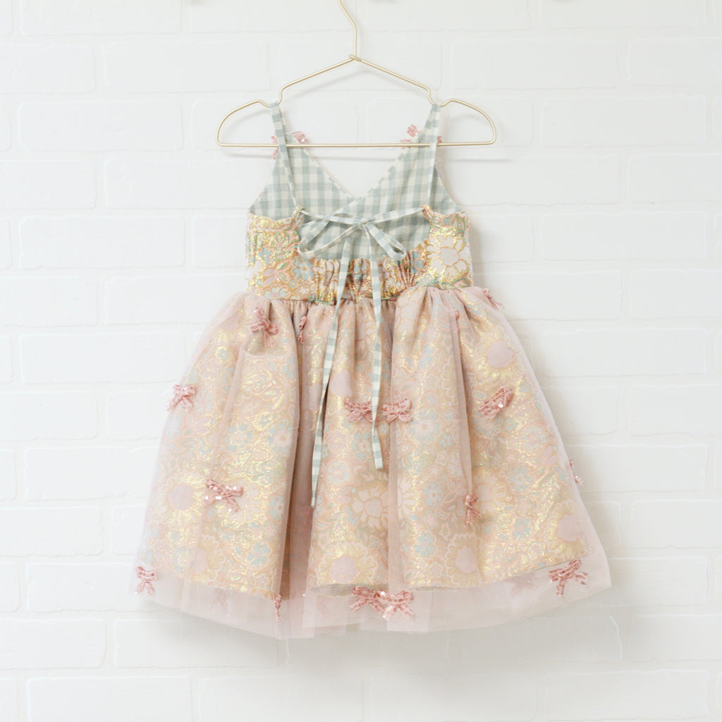 Floral brocade dress with pink mesh overlay skirt. Brocade has aquamarine blues, pinks and gold. Pink mesh has pink mesh sequins bow accents. Aqua and ivory ties back straps. Bow, flower and bead shoulder accents. Elastic back, tie straps. Dress kits at the knees.