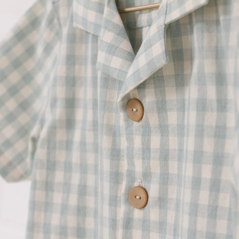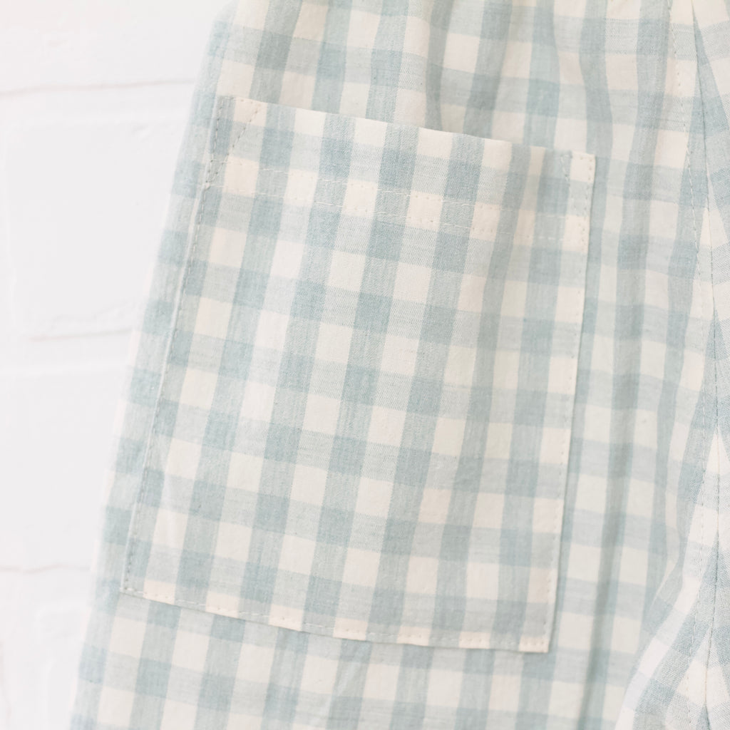 Aqua gingham top and shorts set. Button down top. Collar. Back ease yoke. Curved hem. Short sleeve. Shorts hit mid thigh. Back Pockets. Faux tie accent. Elastic waist.
