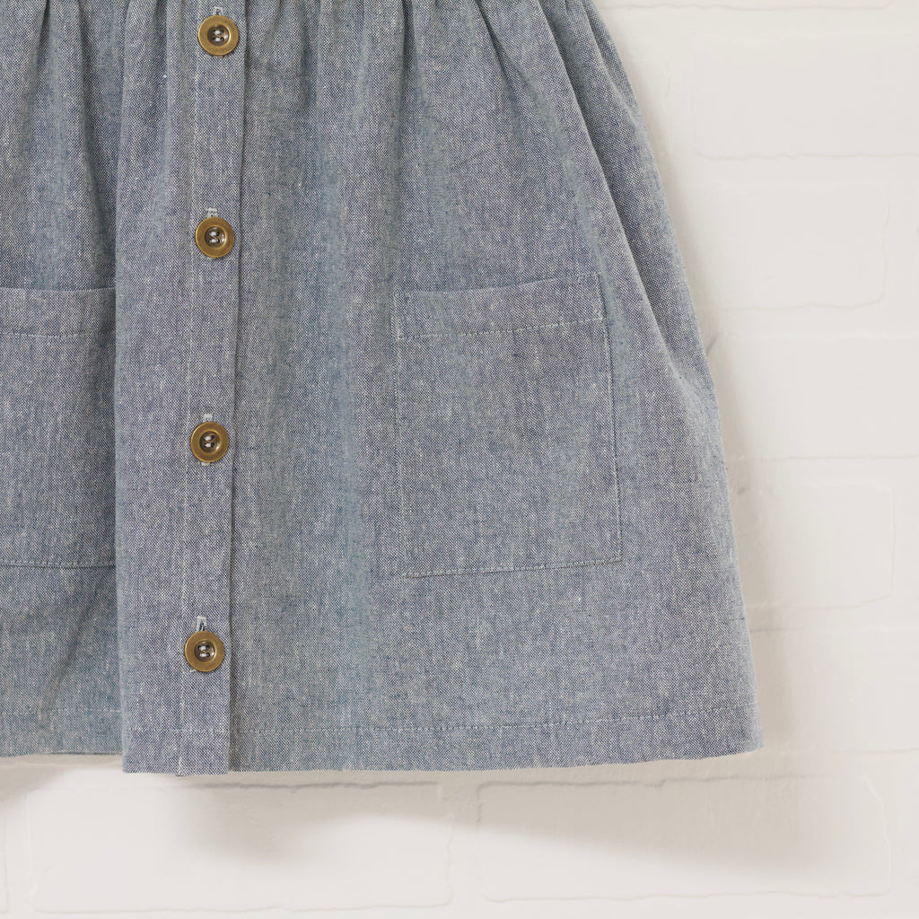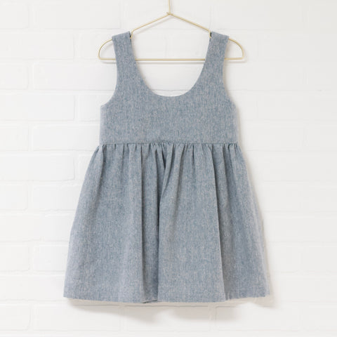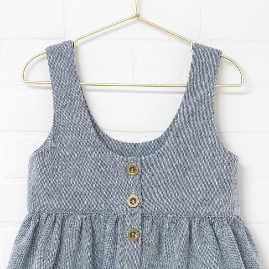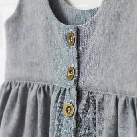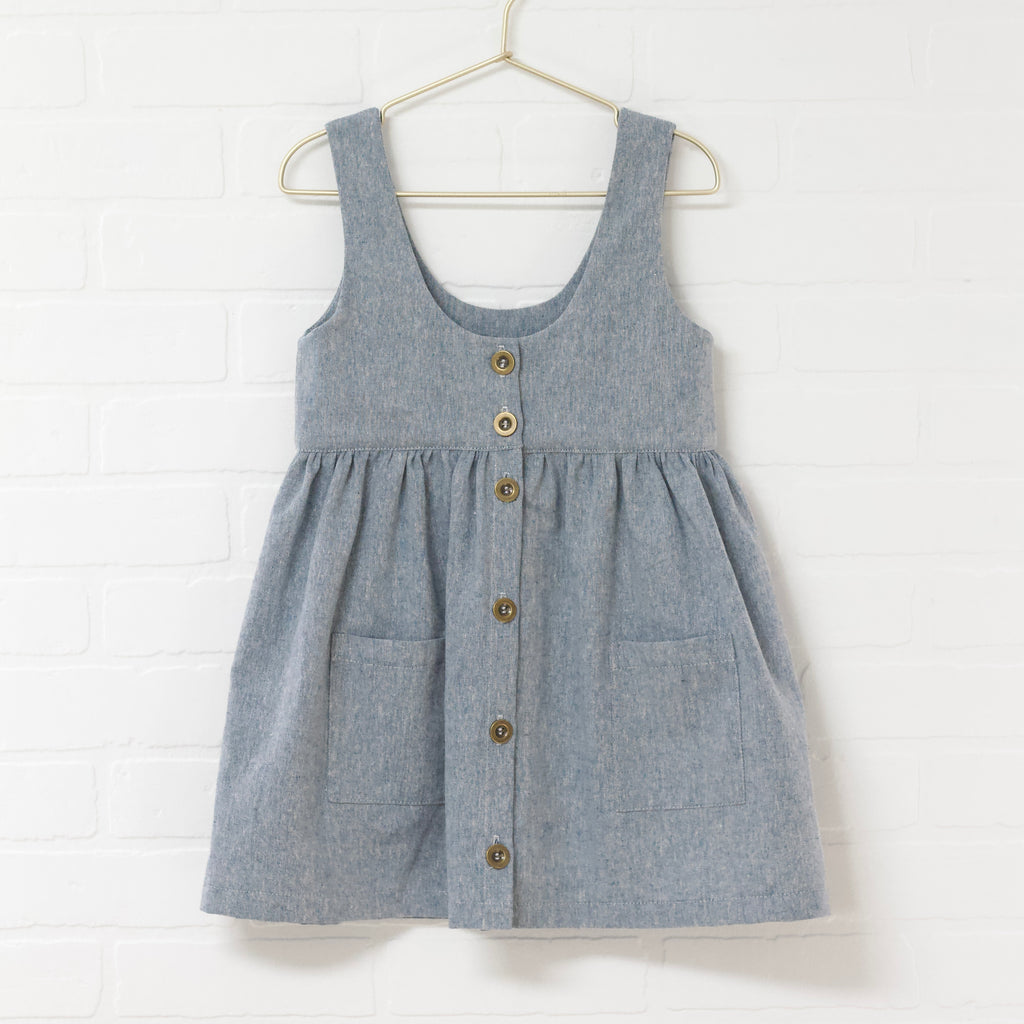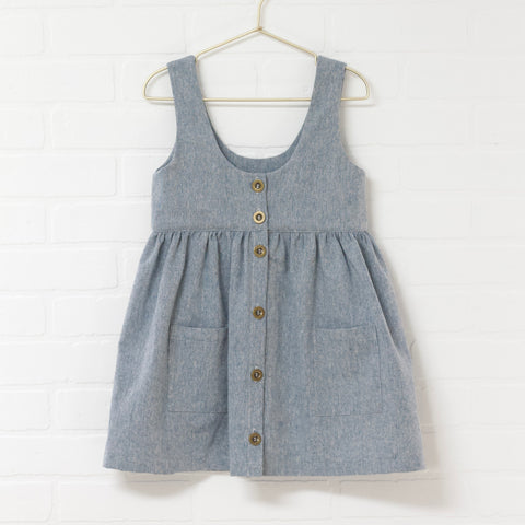 Heather blue button down pinafore. Scoop front and back neckline. Hits at the knee. Front pockets. Linen and cotton blend. Functional button placket.