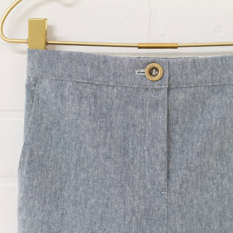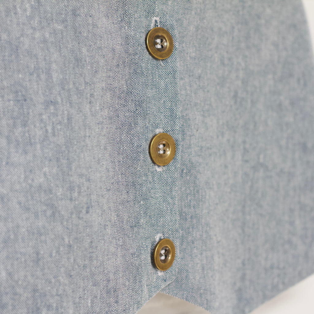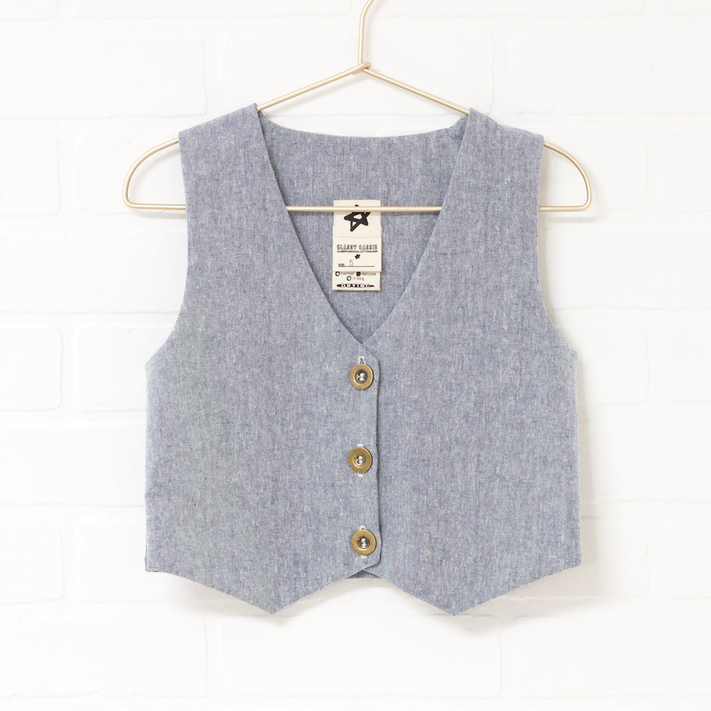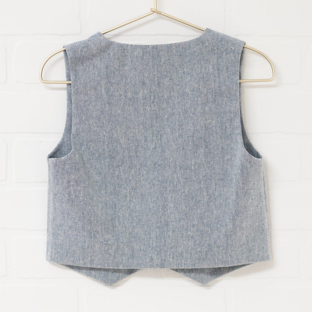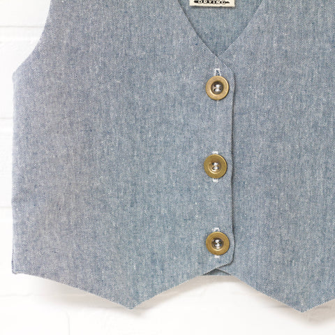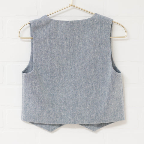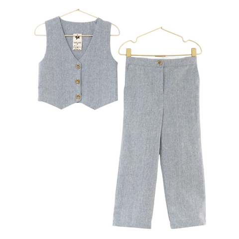 Heather blue linen blend vest and pant set. Single breasted fitted vest. Straight slim pant. Pants have an elastic back waist, faux zip fly and button accent. Full length. Front pockets.