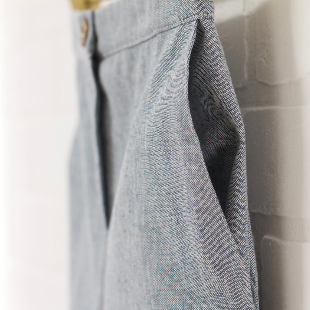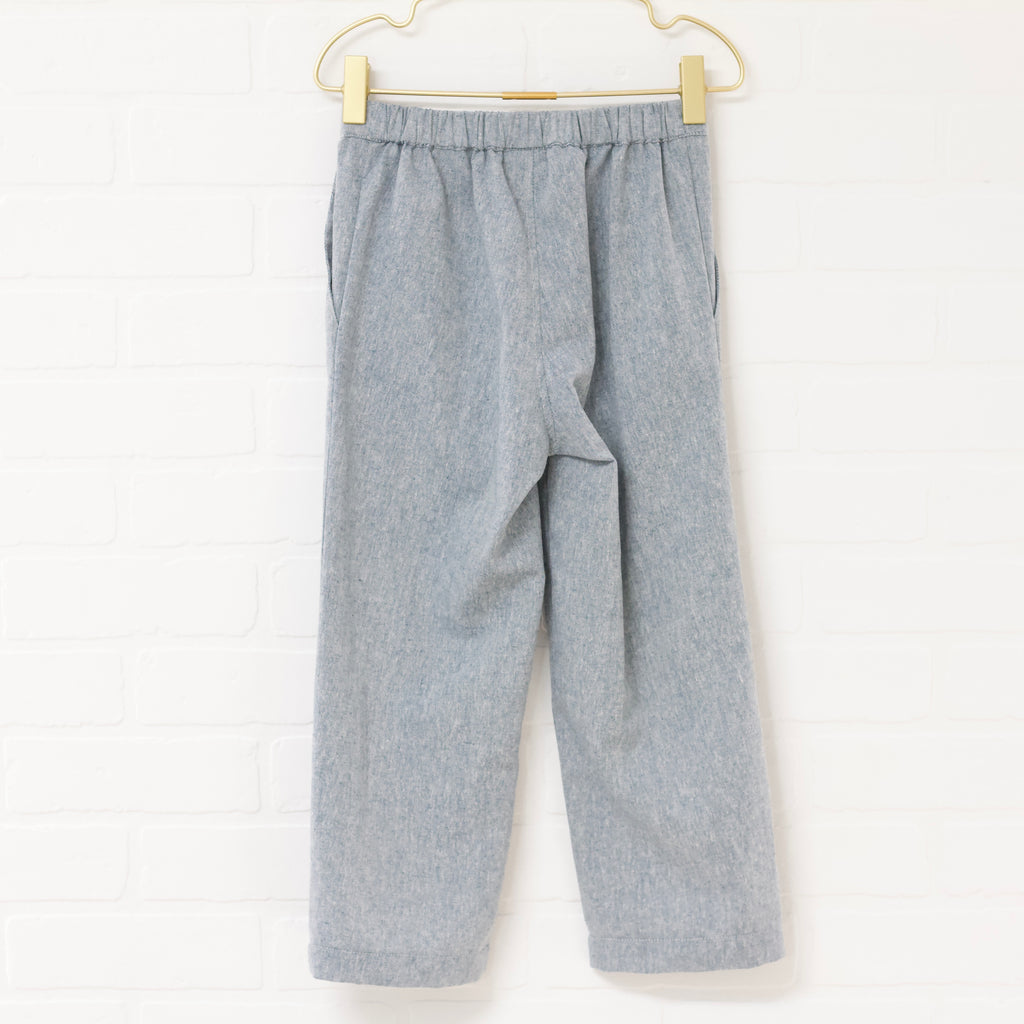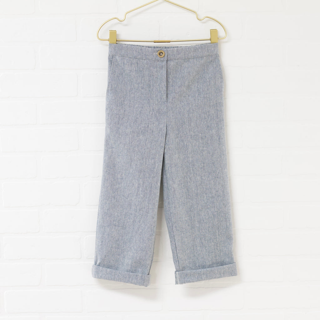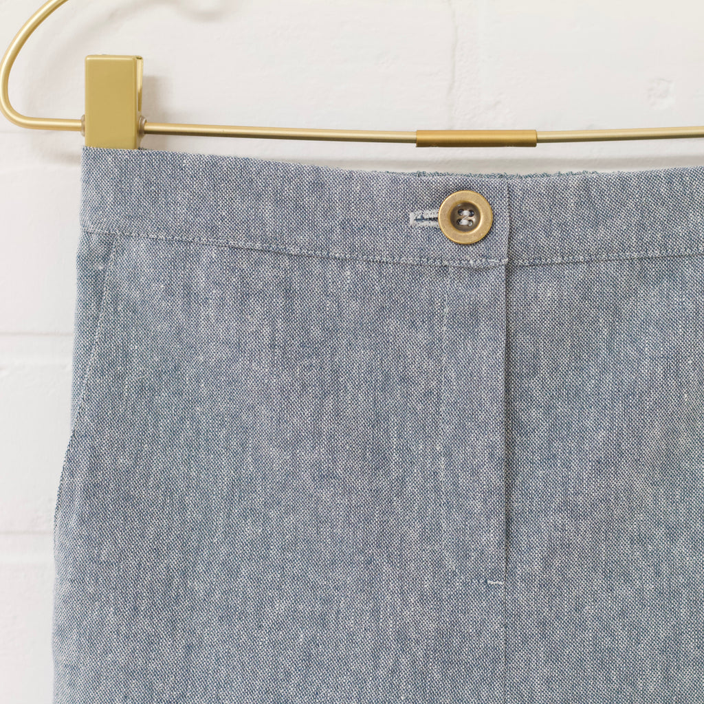 Heather blue linen blend vest and pant set. Single breasted fitted vest. Straight slim pant. Pants have an elastic back waist, faux zip fly and button accent. Full length. Front pockets.