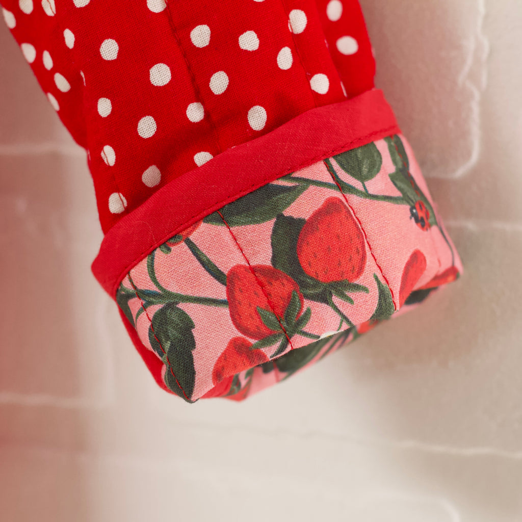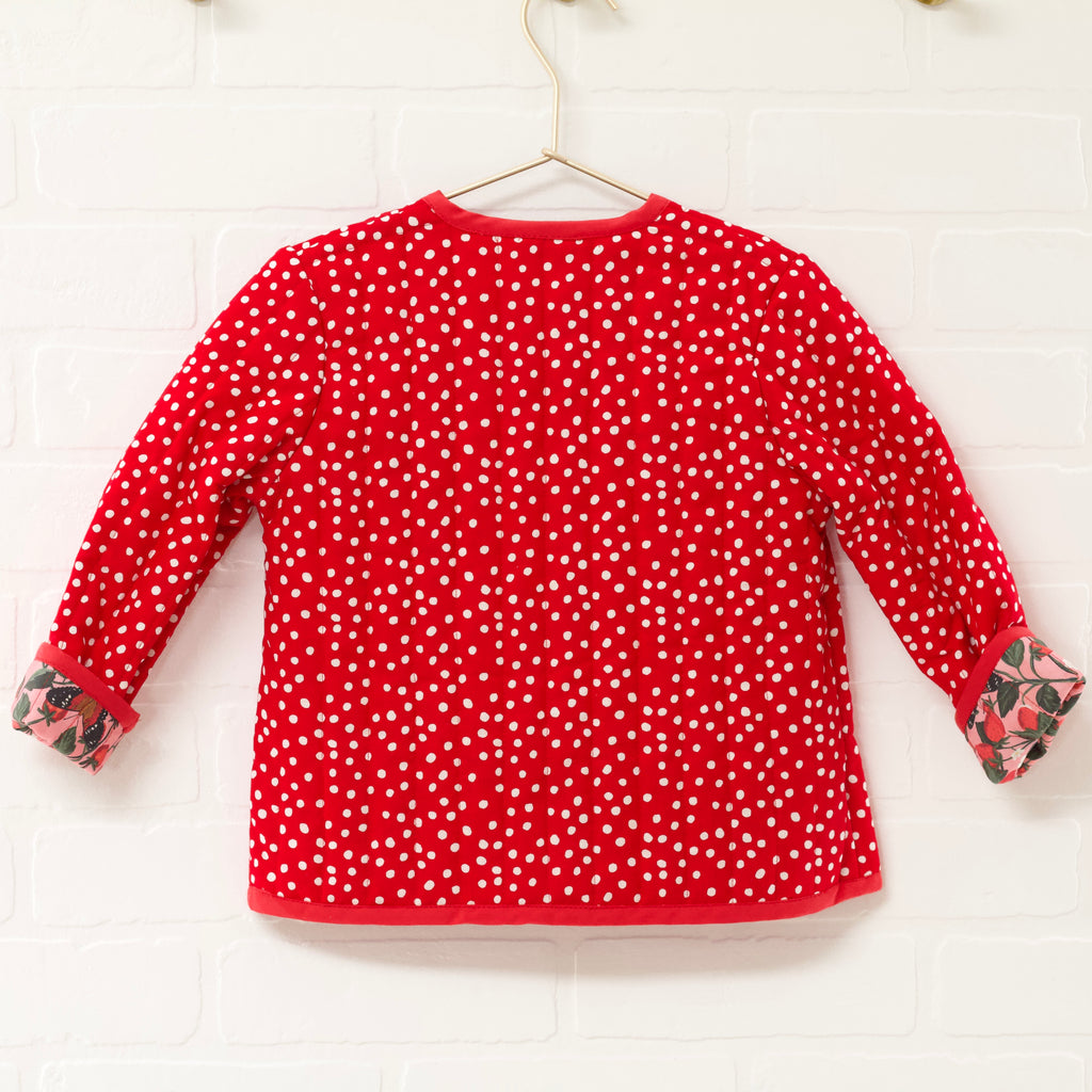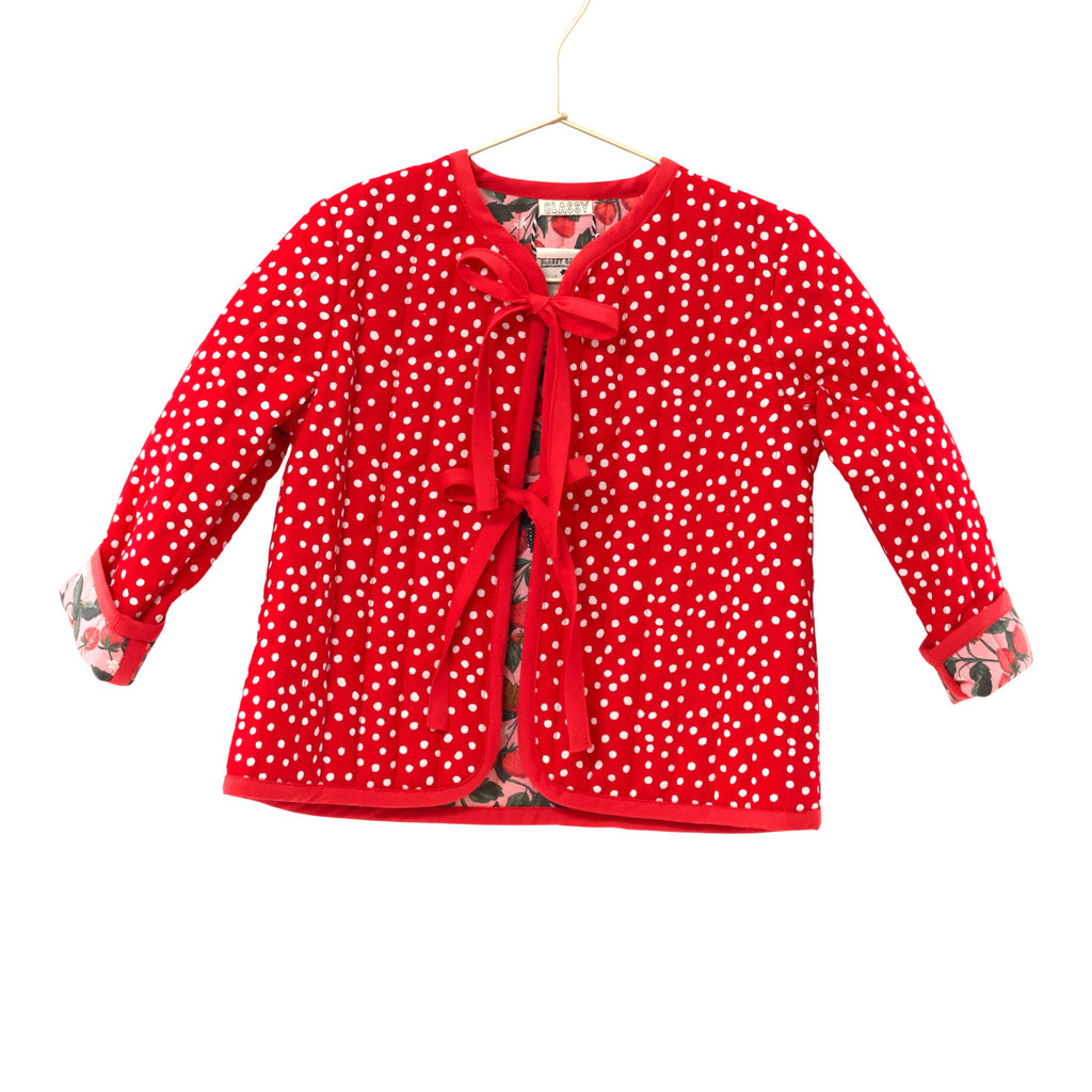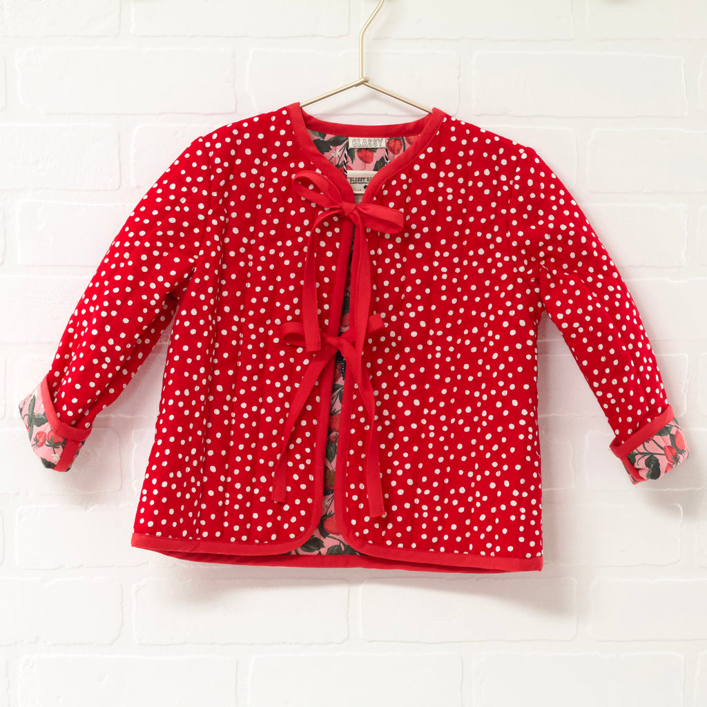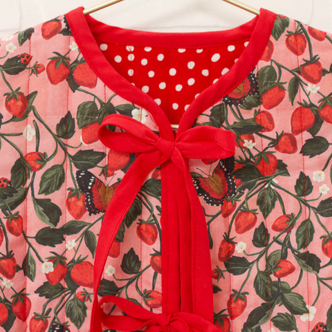 The most darling Reversible hand quilted coat. Made with ultra loft polyester batting. Red Bias trim. Two red tie closures. Long sleeve. Length hits at hips. Side A: Red base with white polka dots. Side B: Pink Base with strawberries on the vine, white flowers and brown butterflies print. Red bias trim line the seams.