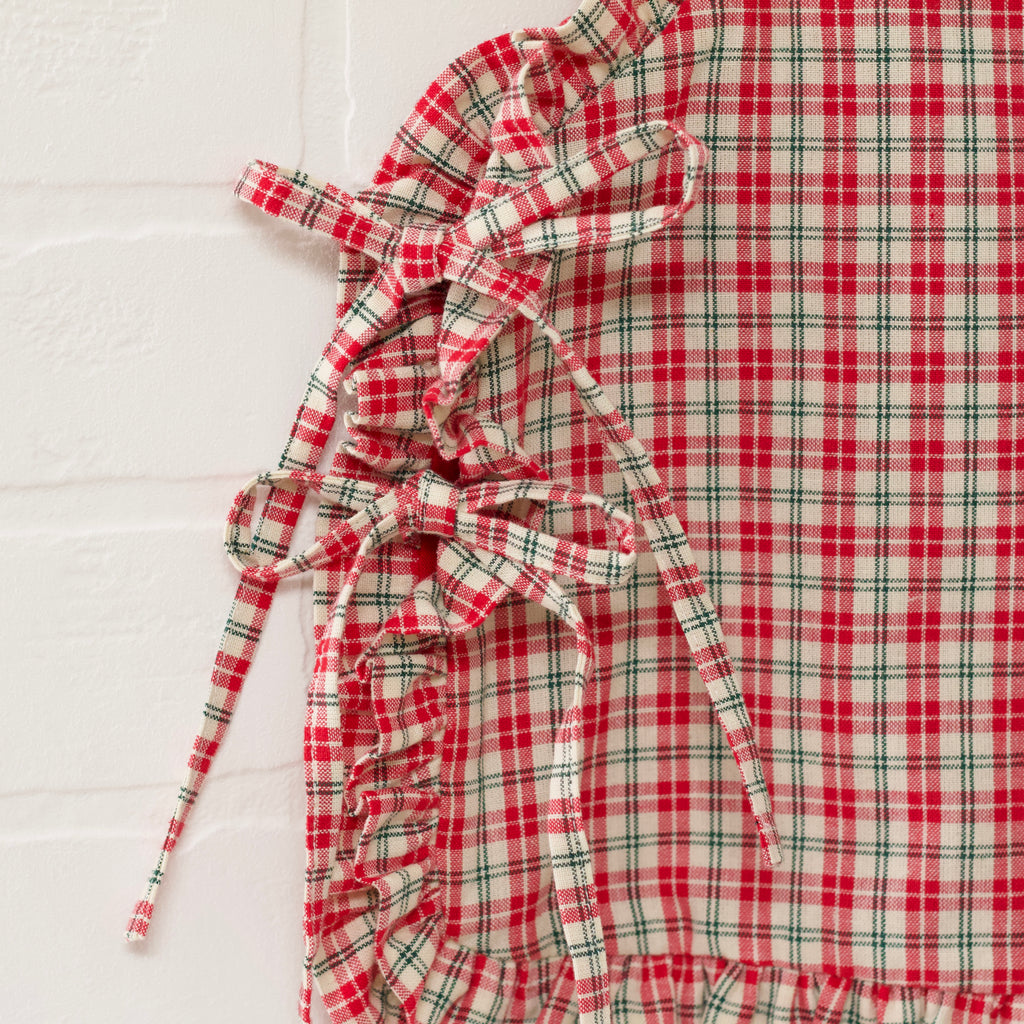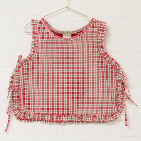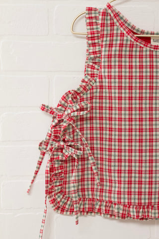 Pull over vest. Ruffle accent. Side ties on both sides. Length hits at the pant line. Ivory base with red and green plaid. Red lining. Plenty of room for layering. Adjustable chest measurement due to side ties.