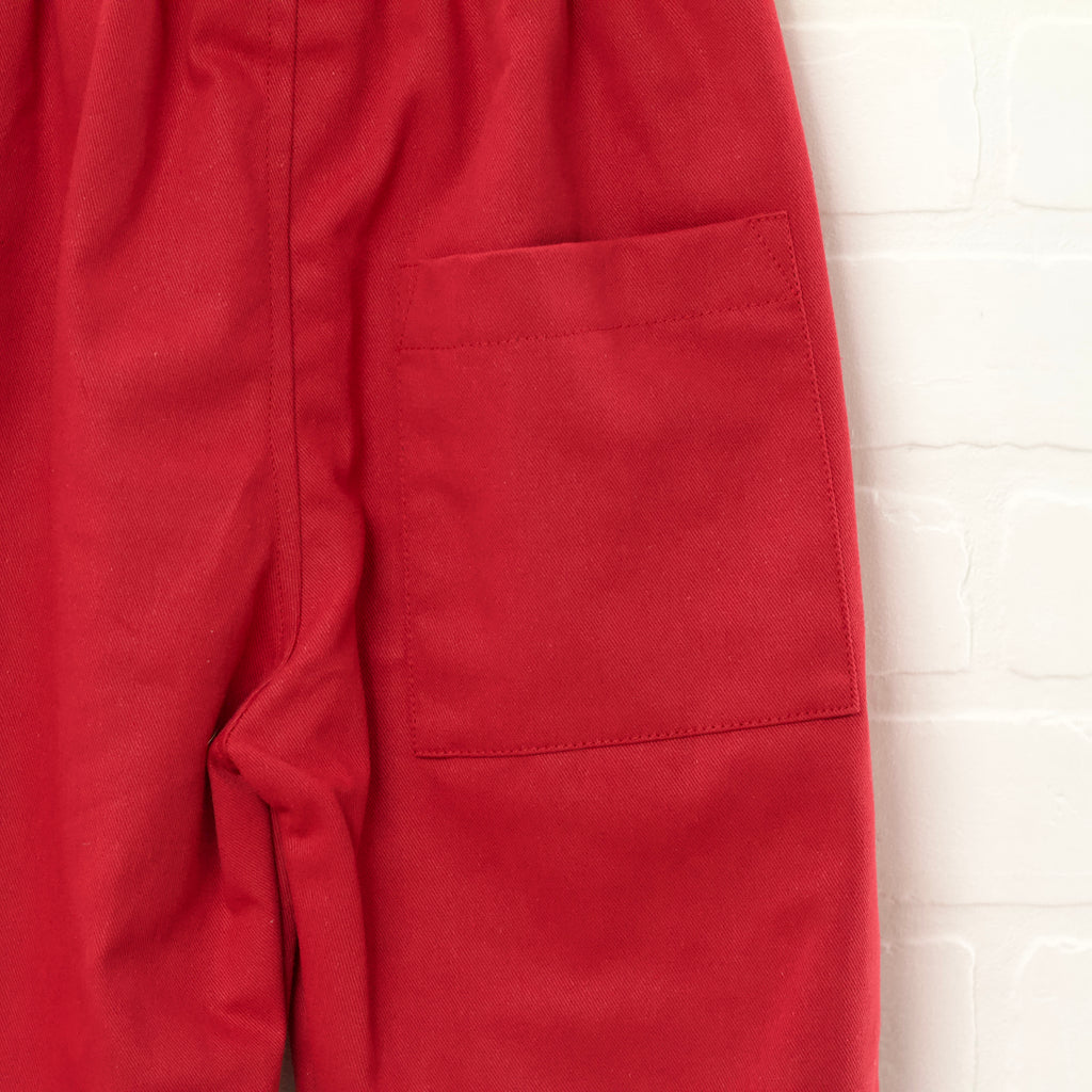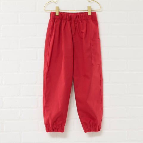 Pant: Red twill fabric. Side accent pocket and back pocket. Elastic waist and ankle. Slouchy fit. Full length