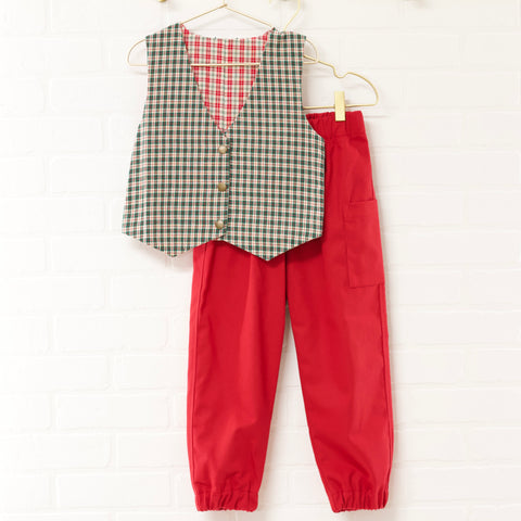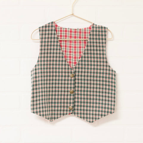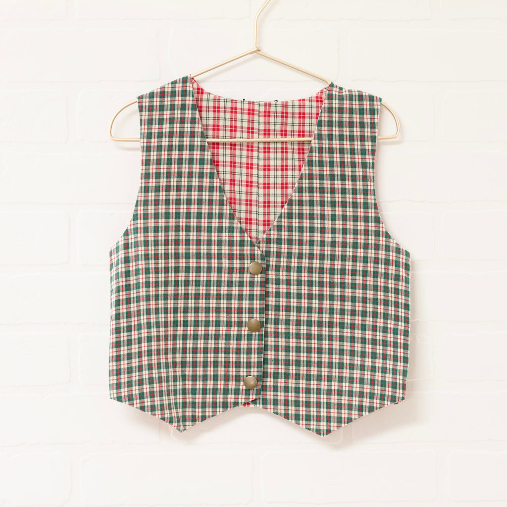 Vest: Reversible vest. Snap closure. Bronze heavy duty metal snaps. Fitted. Side A: Green plaid with ivory base and red accents. Side B: Ivory base with red and green stripes. Back ends at the natural waist. Front hits at the pant line.