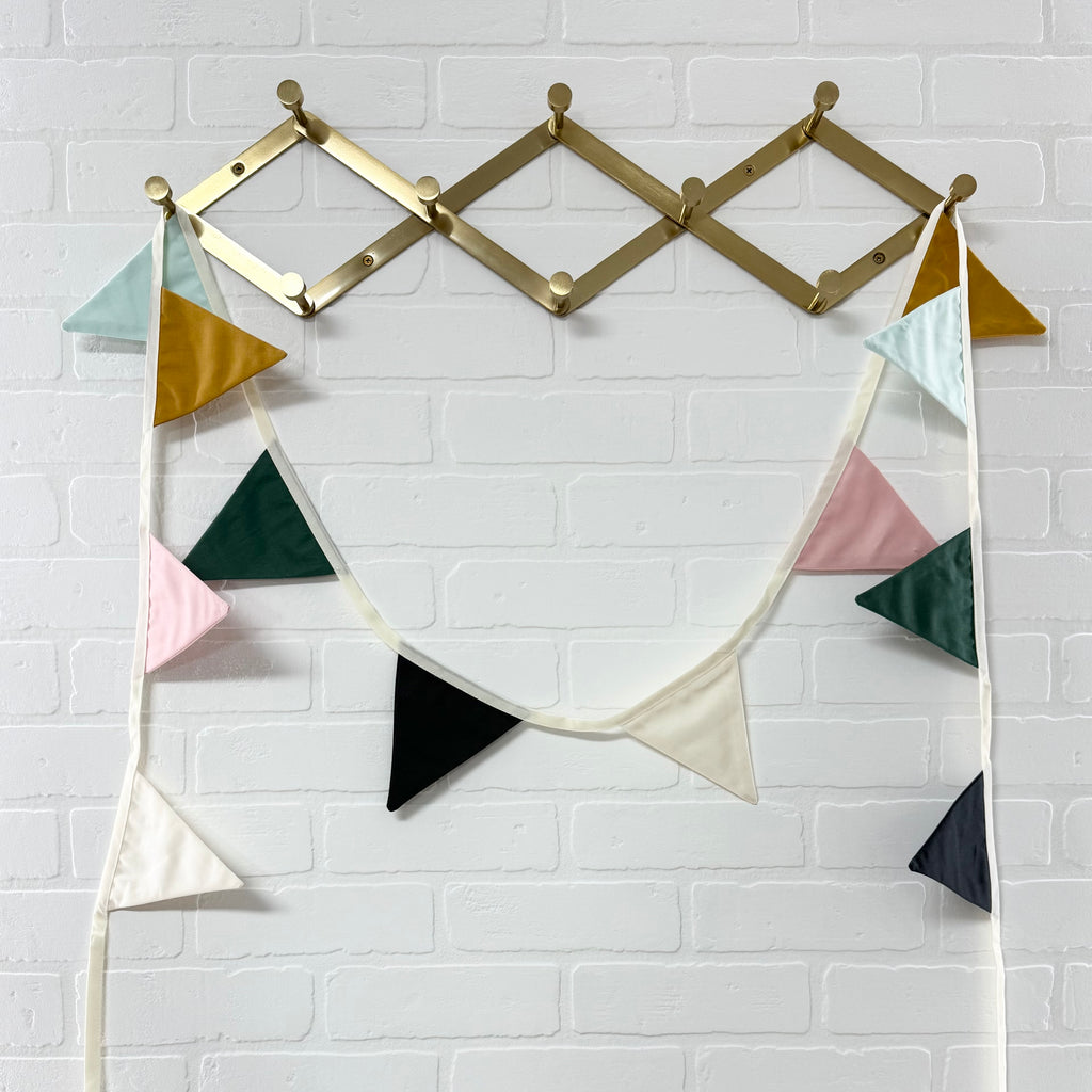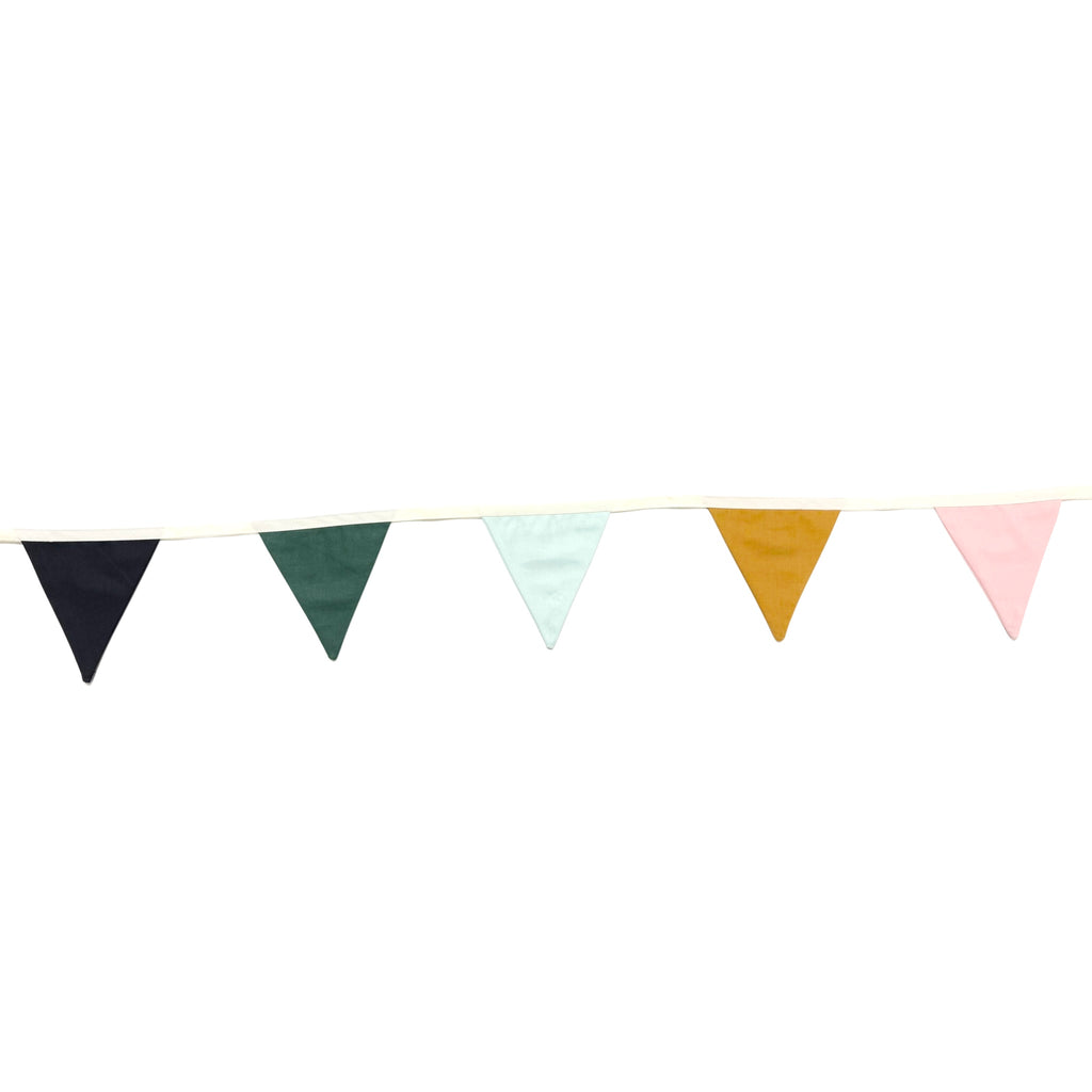 Pennant bunting banner comprised of 12 flags in classic Classy Cassie colors. Colors included are 2 Ivory, 2 light pink, 2 mustard, 2 aqua, 2 hunter green, 2 dark gray. Ivory Bias.