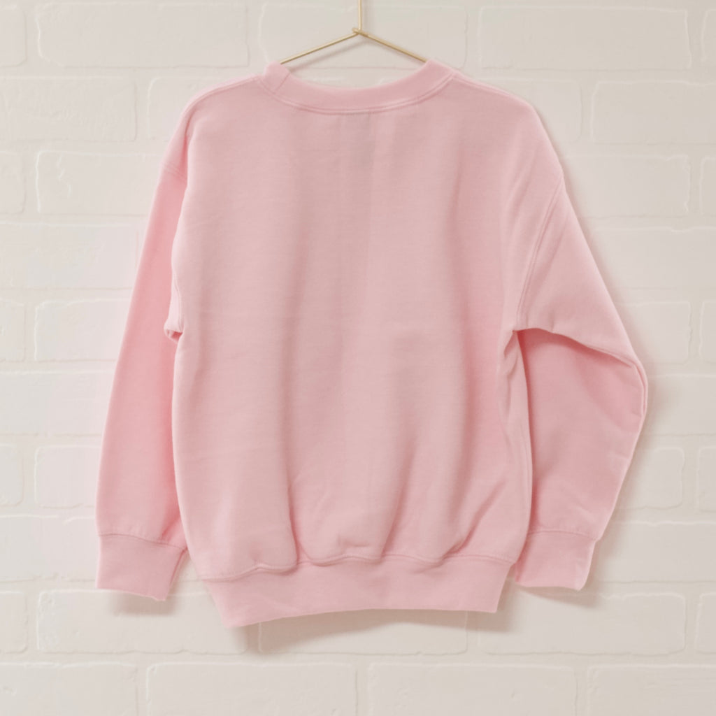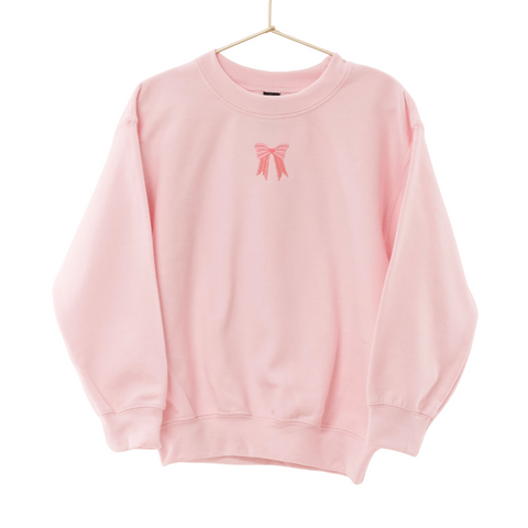 Light pink crewneck pull over sweatshirt with multi pink embroidered bow. Sweatshirt is Gildan brand youth heavy blend.