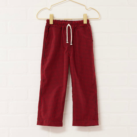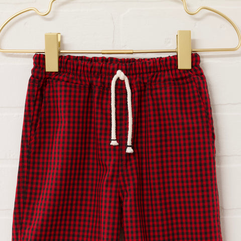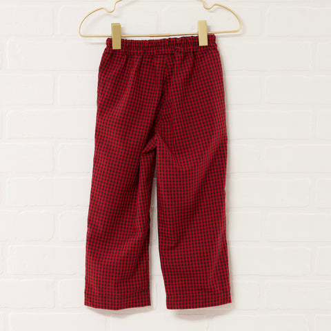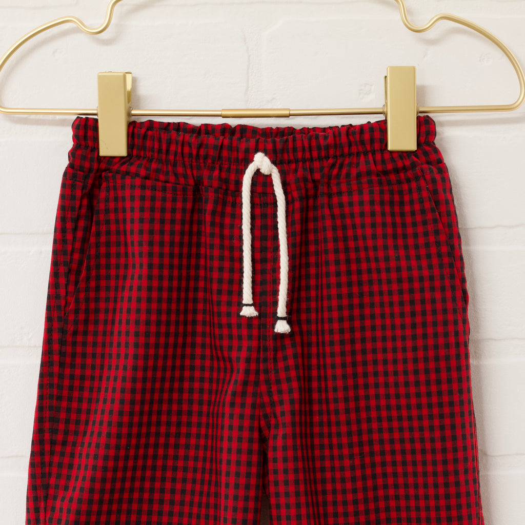 Red and black gingham check slim straight pants. Front pockets. Faux drawstring. Full length. Elastic waist.